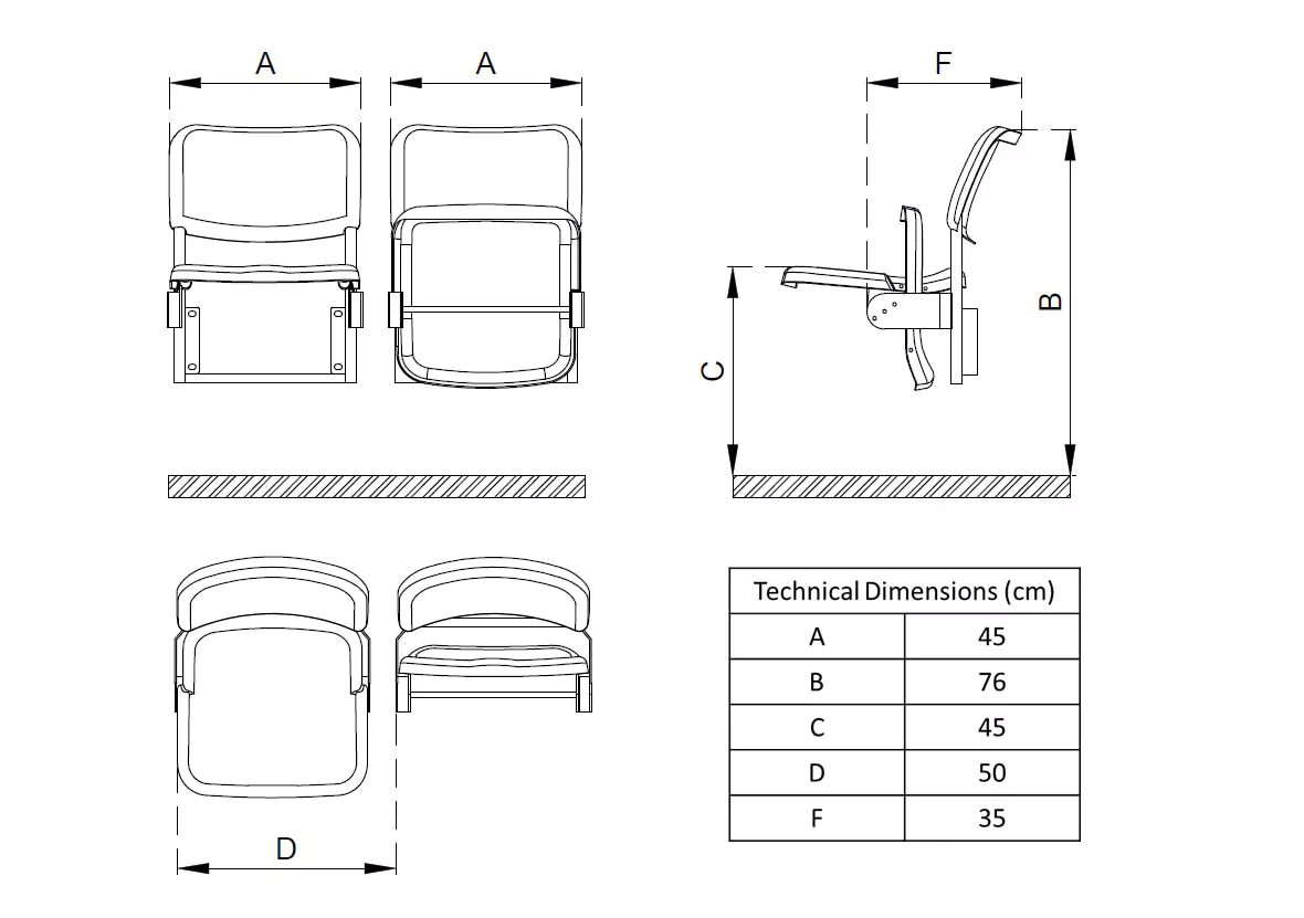 AZURITE 02 This foldable stadium seat combines space-saving design with comfort, featuring a tip-up mechanism and backrest. Built with weather-resistant plastic for long-term outdoor use. Suitable for modern sports facilities.