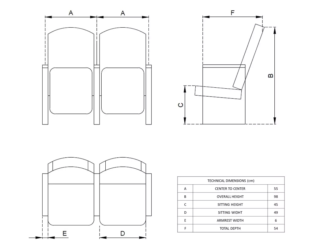 OPAL AP 2 A nod to traditional theatre design, this chair features wooden armrests and a timeless silhouette. The cushioned seat and backrest provide modern comfort. Perfect for heritage venues seeking authenticity.
